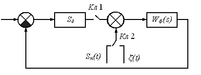 Радиотехнические системы работают в условиях многолучевого распространения радиоволн, поэтому при приеме сигнала наблюдается эффект замирания сигнала. Попадание на вход приемника мощной широкополосной помехи приводит к смещению рабочей точки характеристики активного элемента на нелинейный участок характеристики и в результате – к подавлению полезного сигнала мощной помехой. Сигнал на входе следящей системы пропадает, что эквивалентно размыканию контура. На структурной схеме (Рис.6) это явление можно отобразить введением двух ключей Кл1 и Кл2. Пропадание сигнала приводит к размыканию ключа Кл1 и переводу ключа Кл2 в положение 2, поскольку меняется характер флюктуаций.