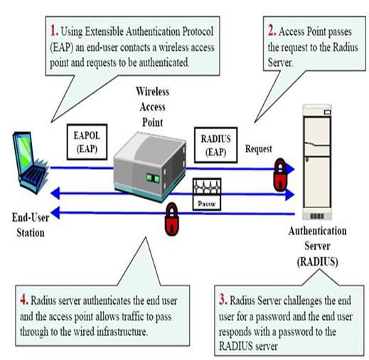 RADIUS - протокол призначений для роботи в парі з сервером аутентифікації, в якості якого звичайно виступає RADIUS – сервер. В цьому випадку безпроводові точки доступу працюють в enterprise– режимі.