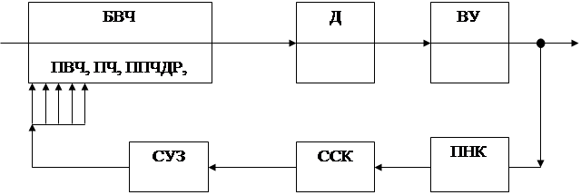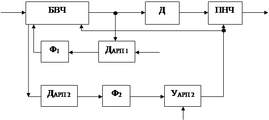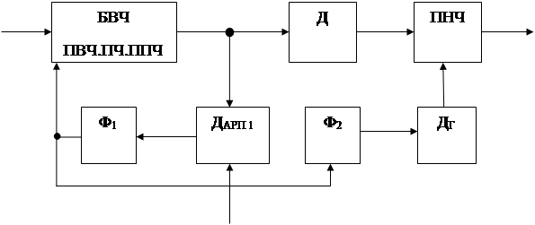 Зворотня система АРП утворюється детектором АРП ДАРП 1 , фільтром Ф1 і всіма каскадами основного тракту, розташованими між точкою прикладення регулюючої напруги Uр1 і виходом блоку високої частоти (БВЧ).