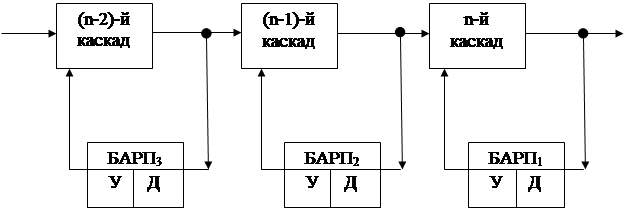 По ступені швидкодії розрізняють інерційніАРП і швидкодіючі АРП (ШАРП). Ступінь швидкодії визначається відносно швидкості зміни інтенсивності сигналу. Висока швидкодія не дозволяє одержати великої глибини регулювання з розумінь стійкості, тому для досягнення загальної великої глибини регулювання приходиться застосовувати кілька послідовних кілець ШАРП (рис. 4. Послідовні кільця ШАРП), причому найчастіше одне кільце охоплює всього один підсилюючий каскад.