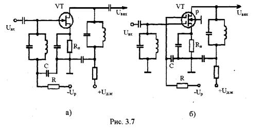 Принципові схеми введення напруги UР стосовно до польових транзисторів приведені на рис. 7. У схемі рис. 7, а регулююча напруга вводиться в ланцюг затвора через СR - фільтр, що володіє малою постійної часу і призначений тільки для фільтрації складових несущої частоти сигналу. Напруга UР має негативний знак, тому що використовується транзистор з n-каналом, а збільшення Uр повинне приводити до зниження крутизни.
