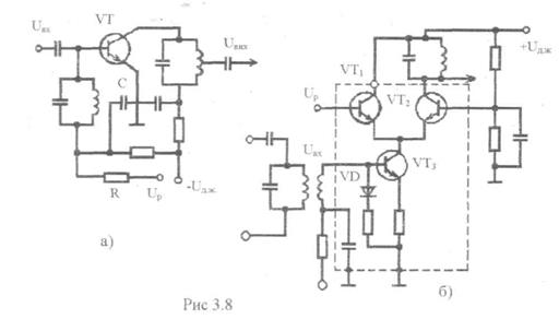 В основі регульованого підсилювача, зображеного на рис. 8, б, лежить часто використовувана в прийомній техніці диференціальна мікросхема в особливому включенні. Транзистори VТ3 і VТ2 утворюють каскодне з'єднання. Регулююча напруга подається на базу транзистора VТ1. При підвищенні напруги Uр транзистор VТ1 усе більше відмикається, його струм збільшується. Одночасно падає колекторний струм транзистора VТ2 , тому що сума цих струмів дорівнює току транзистора VТ3 і практично постійна. Таким чином, регулювання підсилення відбувається за рахунок непрямого впливу напруги Uр на струм і крутизну транзистора VT2 завдяки перерозподілові струму транзистора VТ3 , між транзисторами VТ1 ,VТ