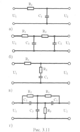 Перехідні процеси, стійкість, перекручування комплексної огинаючої сигналу при дії АРП багато в чому залежать від властивостей і виду фільтра, що входить у систему АРП. В основному використовується одноланковий RС-фільтр низьких частот (рис. 11 ,а).Він дає аперіодичний процес установлення підсилення і забезпечує стійкість системи, якщо є єдиною інерційною ланкою. Рідше застосовується двухланковий RС-фільтр низьких частот (рис. 11, б),що дає аперіодичний процес установлення тільки при визначеному співвідношенні постійних часу ланок і не забезпечує абсолютної стійкості системи АРП. Однак він може забезпечити велику швидкість перехідного процесу. Використовуються також одноланкові кореговані RС-фільтри низьких частот (рис. 11 ,б). Подібний фільтр по порівнянню з фільтром рис. 11, а дає менше фазовий зсув між напругами U2 і U1 при більшому коефіцієнті передачі в області вищих частот Ω→∞ [ при Kф →R2 /(R1 +R2 ) ]. В спеціальних випадках може застосовуватися фільтру виді подвійного Т-образного моста (рис. 11, г),що має Кф = 0 на частоті балансу. Частоту балансу беруть рівній частоті корисної модуляції сигналу. Іноді роль фільтра, що визначає інерційність системи АРП, грає навантажувальний ланцюг детектора АРП, тобто використовується інерційний детектор.
