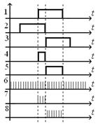 С помощью триггера Т1 регенерируется входной сигнал методом стробирования. В синфазном режиме стробирование соответствует середине элементарной импульсной посылки. Информация с Т1 записывается в Т2, таким образом, на выходе Т1 и Т2 мы имеем 2 импульсных потока сдвинутых на полтакта. С помощью схем сумматоров по модулю два определяется фазовое рассогласование (эпюры 6,7), преобразуемое в счетно-импульсный код, поступающий на реверсивный счетчик.