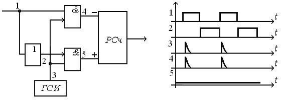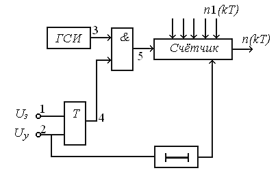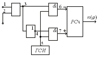 , и в контрольной точке 3 длительности импульсов равны длительностям пауз. Чтобы определить разность длительностей импульсов и пауз, пропорциональную величине ошибки, эти длительности преобразуются в код путем их заполнения счетными импульсами, формируемыми генератором счетных импульсов ГСИ. Счетно-импульсный код поступает на реверсивный счетчик РСч, на выходе которого формируется код ошибки.
