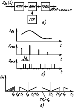 Рис. 1 Устройство, осуществляющее ИКМ (а), временная диаграмма процесса ИКМ (б), спектр дискретизированного сигнала (в)