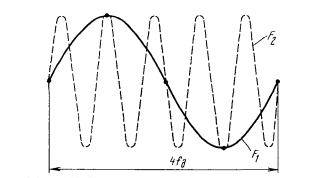 Значение частоты дискретизации ограничивает разрешающую способность аналого-цифрового преобразования во времени и, следовательно, наивысшую возможную частоту на входе АЦП. Наглядной иллюстрацией этого служит рис. 1. Процедура дискретизации с одной и той же частотой f д представлена на рисунке одновременно для двух тональных сигналов низкой (F1 – сплошная линия) и высокой (F2 – штриховая линия) частот. В обоих случаях после дискретизации имеем идентичные временные последовательности значений отсчетов. Следовательно, сигналы этих двух частот F1 и F2 нельзя различить и после обратного преобразования правильно восстановить (реконструировать).