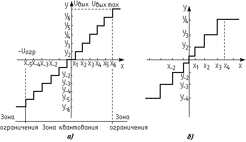 Характеристика квантования (см. рис. 4 а) имеет две зоны: квантования при Uвх < Uогр и ограничения при Uвх > Uогр. Зона квантования является рабочей областью характеристики. В ее пределах выполняется квантование сигнала. Если мгновенное значение сигнала выйдет за пределы зоны квантования, то выходное напряжение будет оставаться неизменным и равным Uвыхmaxнезависимо от значения Uвх. Возникающие при этом искажения имеют характер безинерционного ограничения сигнала и считаются недопустимыми. Разность между исходным и ограниченным сигналами называют шумом ограничения. Итак, квантование – это безинерционно-нелинейное преобразование сигнала, при котором (в отличие от дискретизации) сигнал нельзя передать со сколь угодно малой ошибкой ни при каком конечном шаге квантования.