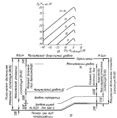 Выражение для отношения С/Ш определяет в конечном итоге значение максимального динамического диапазона ЗС, который может быть передан по цифровому каналу без появления искажений. На практике в трактах формирования программ звукозаписи обычно используется 16-разрядное равномерное квантование. При разрядности т кодового слова, равной 16 битам (размер кодового слова системы компакт-диска) формула дает нам значение 97,8 дБ. Однако отсюда следует вычесть величину приблизительно равную 1,5…2,0 дБ, определяющую дополнительные погрешности, свойственные аналого-цифровому и цифро-аналоговому преобразованиям. Далее в соответствии с Рекомендацией СС1К эту величину с учетом пик-фактора следует уменьшить еще на 12 дБ (при пересчете уровня мощности шумов квантования в величину, соответствующую получаемой при измерении). Для защиты канала от возможного превышения максимального уровня это значение уменьшают еще на 10 дБ. И наконец, чтобы избежать слишком больших погрешностей при квантовании низких уровней сигнала и обеспечить при обратном преобразовании маскировку шумов квантования полезным сигналом, его уровень должен превышать уровень шумов по крайней мере на 20 дБ. С учетом изложенных соображений получаем, что при т = 16 значение динамического диапазона исходного ЗС на входе цифрового тракта в этом случае не должно превышать ═ Dc = (6т + 1,8) – (1,5…2,0) – 12 – 20 = 54 дБ (рис. 5.б). Напомним, что после обработки звукорежиссером динамический диапазон ЗС обычно не превышает 40 дБ в радиовещании и 50 дБ при высококачественной звукозаписи, например на компакт-диск. При 16-разрядном кодировании и частоте дискретизации f д =48 кГц скорость передачи цифрового потока Vпер = mf /д составит для монофонического сигнала Vперм = 16 ∙ 48 = 768 кбит/с, а для стереофонического – соответственно Vперст = 2 (16 ∙ 48) = 1536 кбит/с. При f д = 44,1 кГц имеем соответственно Vперм = 705 кбит/с и Vперст =1411,2 кбит/с.