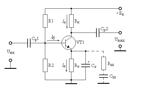 Транзистор ввімкнутий за схемою зі спільним емітером: джерело сигналу, емітер та навантаження каскаду мають спільну точку. Схема містить кола живлення з фіксованою напругою Uбе й емітерну стабілізацію робочої точки, яка ґрунтується на послідовному негативному зворотному зв’язку НЗЗ через резистор Rе. Напруга UR2 >URе на 0,1...0,5В, і транзистор відкритий, тобто перехід база-емітер зміщені у прямому напрямку при відсутності вхідного сигналу. Конденсатором Се заблоковано резистор Rе за змінним струмом. Місцевий НЗЗ, потрібний для стабілізації показників підсилювача та зниження спотворень.