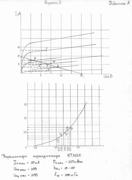 1. Схема використовується для підсилення малих сигналів без спотворень. Напруга змінного сигналу може мати як позитивне, так і негативне значення. Тому й при рівному нулю вхідному сигналі (режим спокою) у транзисторі повинні існувати струми бази та колектора, а для розрахунку робочого режиму транзистора потребуються сімейства вхідних і вихідних характеристик. Які для даного транзистора приведені в додатку А.