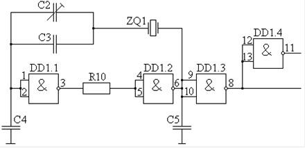 Генератор тактовых импульсов строится на микросхеме К155ЛА3 и кварцевом резонаторе ZQ1.