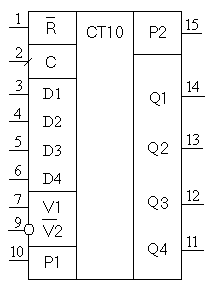 Вывод P1 используется для разрешения переноса импульса в следующий каскад (если соединяются несколько счетчиков последовательно). У нас только один счетчик поэтому на вывод P1 должно постоянно подаваться напряжение высокого уровня. На вход разрешения счета V1 так же должно подаваться напряжение высокого уровня.