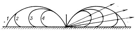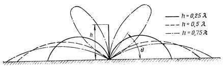 Діаграми направленості антен формуються в результаті додавання хвиль, що приходять у кожну крапку простору по прямій, із хвилями, відбитими від поверхні, що підстилає, тому провідність поверхні, що підстилає, позначається на формі діаграм. На мал.4 показана еволюція форми діаграми направленості у вертикальній площині, зв'язаної з погіршенням провідності ґрунту, над якою розгорнута антена. Коефіцієнт підсилення антени зменшується з погіршенням провідності, а його максимум піднімається на більший кут θ.