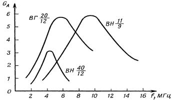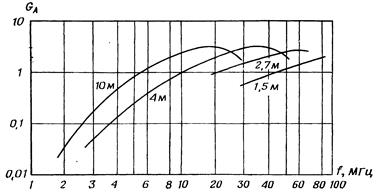 На мал.5 представлені криві залежності абсолютних коефіцієнтів підсилення штирьових антен GА від частоти при роботі земною хвилею, що дозволяють зробити порівняльну оцінку ефективності антен.