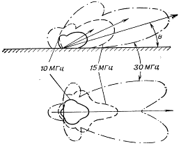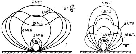 На рис.9 представлені діаграми направленості типового похилого вібратора у вертикальних площинах. З діаграм видно, що в межах деякого діапазону частот (для даного вібратора в межах 1,5-6 МГц) максимум випромінювань приходиться в зеніт. На більш високих частотах діаграми деформуються, а максимум випромінювання зміщається в область менших кутів θ, іншими словами, зменшується кут узвишшя максимуму.