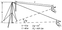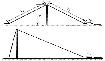 Для збільшення дальності зв'язку в діапазоні метрових хвиль штирьову антену часто встановлюють на щоглі висотою 11-18 м. Роль поверхні, що підстилає, у цьому випадку грають тверді противаги (мал.6). Живлення антени здійснюється за допомогою коаксіального кабелю (фідера).