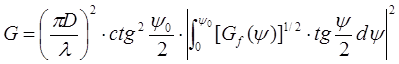 где G - коэффициент направленного действия антенны; D - диаметр раскрыва антенны; ψ0 - искомый угол раскрыва антенны; Gf(ψ) – диаграмма направленности облучателя.