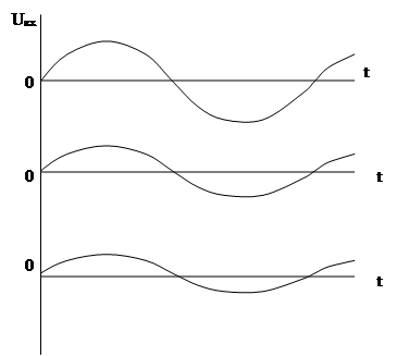 Вихідним сигналом в даній схемі є змінна напруга ~URk,створюватиме змінним струмом Ik~ наRk. Так як Ik~ є частиною Iе~ , який синфазний з напругою вхідного сигналу Uвх , то вихідний сигнал в схемі СБ співпадає за фазою з вхідним сигналом.