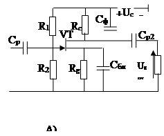 Сф–з’еднує колектор по змінному струму з загальним дротом. Особливістю даного каскаду, визначаючою всі його властивості є те, що напруга підсиленого сигналу, створена на Rе змінним струмом емітера Urе , повністю збігається за фазою з вхідним сигналом (див. Мал.2.2.),напруга Uбе буде рівня різниці напруг вхідного сигналу та Urе (вихідного сигналу).