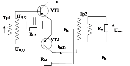 Протягом позитивного півперіду вхідного сигналу через обмотку Трю2 проходить тільки струм ik 2 , так як транзистор VT1 буде практично закритий. При від’ємному півперіоді стан транзисторів VT1 та VT2 змінюється на протилежний: відкритий VT1, закритий VT2.