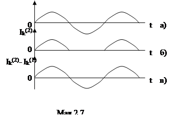 Результуючий струм в обмотці Тр.2 рівний різниці струмів i(1) k та i(2) k (мал.2.7.в) повторює форму вхідного сигналу(звідсіля і назва схеми-двутактна).