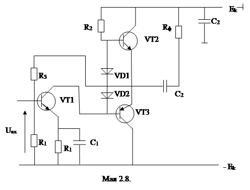 Варіант схеми безтрансформаторного ДПП на транзисторах різної провідності зображен на мал.2.8.
