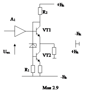 При побудові схем ДПП на однотипних транзисторах необхідно як і в попередній схемі (мал. 2.8) забезпечити почергову роботу транзисторів тільки протягом половини періода підсилюваємого сигналу. В режимі спокою вихідні транзистори ПП повинні знаходитись в однаковому стані з можливо меншим струмом колектора спокою. При цьому схма ПП будується итак, щоб відкриття одногоз транзисторів відкликало закритт іншого. Ці схеми отримали назву схем з послідолвним збудженням (управлінням) елементів, що підсилюють.