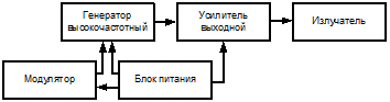 Генератор высокочастотный создает немодулированные электрические колебания с частотой 2,64 МГц. Усиление мощности этих колебаний происходит в выходном усилителе, к которому подключается один из ультразвуковых излучателей, преобразующий электрические колебания в механические. Модулятор предназначен для получения импульсного режима при трех длительностях импульсов — 2, 4 и 10 мс и постоянной частоте следования — 50 Гц. Блок питания обеспечивает питание постоянным напряжением цепей модулятора и генератора.