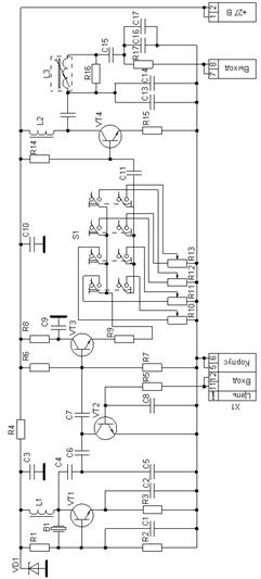 Усилитель (транзистор VT 4 ) имеет на выходе четырехполюсник (конденсаторы 13 — 17 и катушка индуктивности 3 ), согласующий выходное сопротивление транзистора VT 4 со входным сопротивлением выходного усилителя.