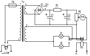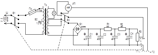 Типовые основные технические характеристики: наибольший выходной ток (при нагрузке 5 ком) 5 мА, коэффициент пульсации выходного тока не более 0,5%; питание от сети переменного тока частотой 50 Гц, напряжением 220В±10%, аппарат должен быть выполнен по II классу защиты от поражения электрическим током. На рисунке 4 в качестве примера представлена принципиальная электрическая схема аппарата гальванизации полости рта. Силовой трансформатор Тр включается в сеть с помощью двухполюсного кнопочного выключателя В1 (кнопка "Вкл. " на панели управления). В сетевой цепи установлен предохранитель ПР1. Вторичная обмотка трансформатора питает выпрямитель, собранный на мосте Д1-Д4 с П-образным резистивно-емкостным фильтром, резистор 1, электролитические конденсаторы 1,2. К выходу фильтра подключен потенциометр 2, ось которого выведена на панель управления аппарата для регулирования тока в выходной цепи. В цепь движка потенциометра включен миллиамперметр mА для измерения тока, проходящего через тело пациента.