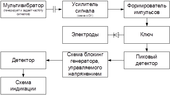 На рис. 1 представлена структурная схема аппарата. Генератор импульсов представляет собой мультивибратор. С выхода мультивибратора прямоугольные импульсы после дифференцирования поступают на вход ограничителя - формирователя. С помощью этого каскада из отрицательных пиков, снимаемых с выхода дифференцирующей цепочки, создаются практически прямоугольные импульсы длительностью 0,5 мс. Прямоугольные импульсы усиливаются выходным усилителем. С нагрузки выходного усилителя- на импульсное напряжение через разделительный конденсатор подается на выходное гнездо «Пациент». В цепь выходного тока включен резистор. Падение напряжения на этом резисторе, пропорциональное амплитуде импульсов тока, подается в блок измерителя. Измеритель представляет собой пиковый детектор, напряжение которого модулирует по амплитуде колебания автогенератора. После усиления высокочастотные колебания детектируются, и постоянная составляющая, пропорциональная амплитуде импульсов в цепи пациента, измеряется миллиамперметром. Помимо генератора импульсного напряжения, аппарат имеет регулируемый источник постоянного тока для создания в выходной цепи дополнительной постоянной составляющей, усиливающей в ряде случаев эффективность импульсного тока. Постоянное напряжение создается с помощью мостового выпрямителя с фильтровыми конденсаторами.