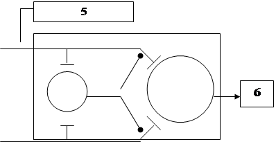 Рисунок 3 - Модель «воротного» контроля боли: 1 - волокна большого диаметра, 2 - волокна малого диаметра, 3 - желатинозная субстанция,4 - Т-клетки, 5 - система центрального контроля, б - система действия