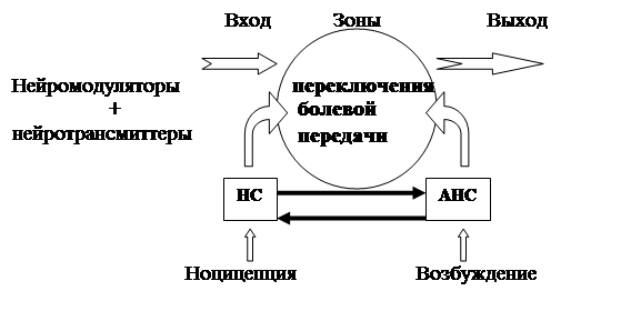 Экспериментальные и клинические работы последних лет показали, что болевые ощущения у человека обусловлены изменением динамического соотношения между уровнямиНМ и НТ. АНС и НС в процессе продукции НМ и НТ оказываются взаимосвязанными т. к. активация одной из систем приводит не только к усилению ее функционирования, но и вызывает торможение другой системы.