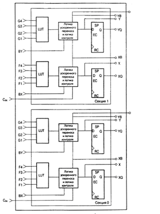 Окрім сигналів синхронізації (Clock) і дозволи синхронізації (Clock Enable – ЦЕ) в кожній секції КЛБ є сигнали синхронної установки (Set) і скидання (Reset). Позначення цих сигналів – SR і BY відповідно.