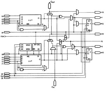 Базовим елементом КЛБ є логічний комірка – ЛЯ (Logic Cell – LC). ЛЯ складається з 4-входового функціонального генератора, логіки прискореного перенесення і елементу, що запам'ятовує. Вихід кожного функціонального генератора кожного логічного комірці приєднаний до виходу КЛБ і до D-входу тригера. Кожен КЛБ серії Virtex містить чотири логічні комірки, організовані у вигляді двох однакових секцій.