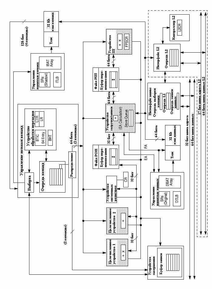 - Блок устройств целочисленной арифметики (FXU) - содержит два целочисленных конвейера и два блока регистров общего назначения (по 32 32-битовых регистра). Выполняет все целочисленные и логические операции, а также все операции обращения к памяти;