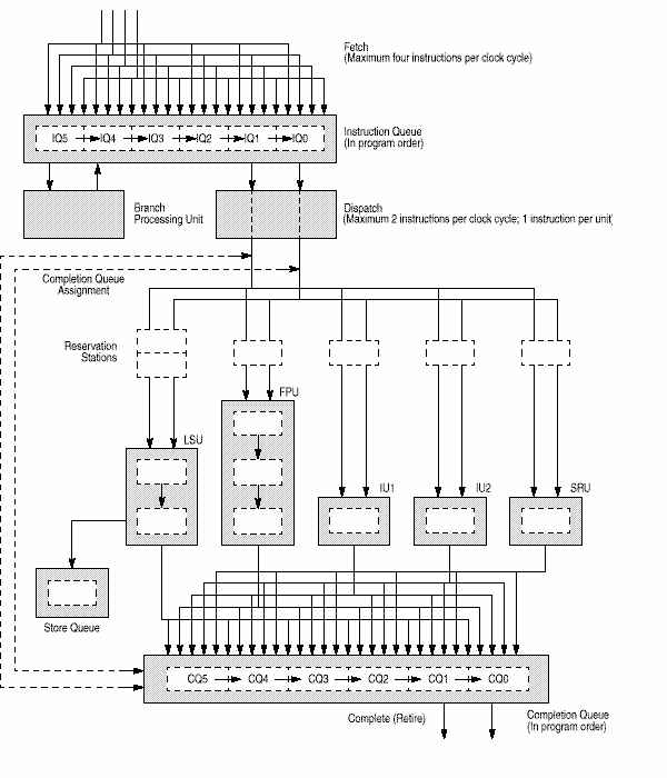 При обработке в процессоре команды распределяются по пяти исполнительным устройствам в заданном программой порядке. Если отсутствуют зависимости по операндам, выполнение происходит немедленно. Целочисленное устройство выполняет большинство команд за один такт. Устройство плавающей точки имеет конвейерную организацию и выполняет операции с плавающей точкой как с одинарной, так и с двойной точностью. Команды условных переходов обрабатывается в устройстве переходов. Если условия перехода доступны, то решение о направлении перехода принимается немедленно, в противном случае выполнение последующих команд продолжается по предположению (спекулятивно). Команды, модифицирующие состояние регистров управления процессором, выполняются устройством системных регистров. Наконец, пересылки данных между кэш-памятью данных, с одной стороны, и регистрами общего назначения и регистрами плавающей точки, с другой стороны, обрабатываются устройством загрузки/записи.