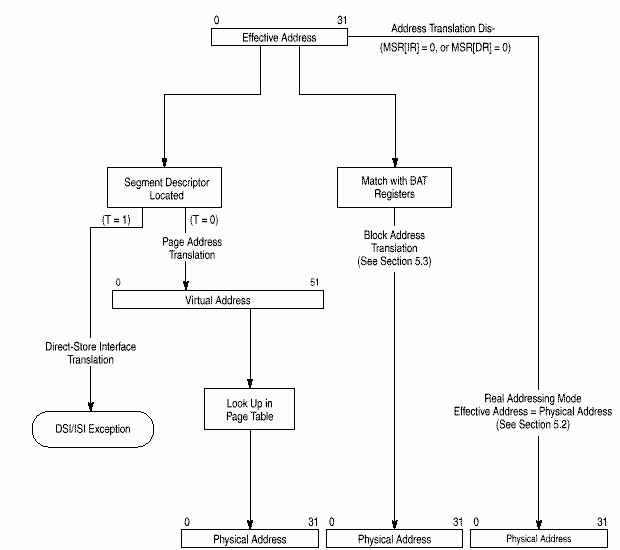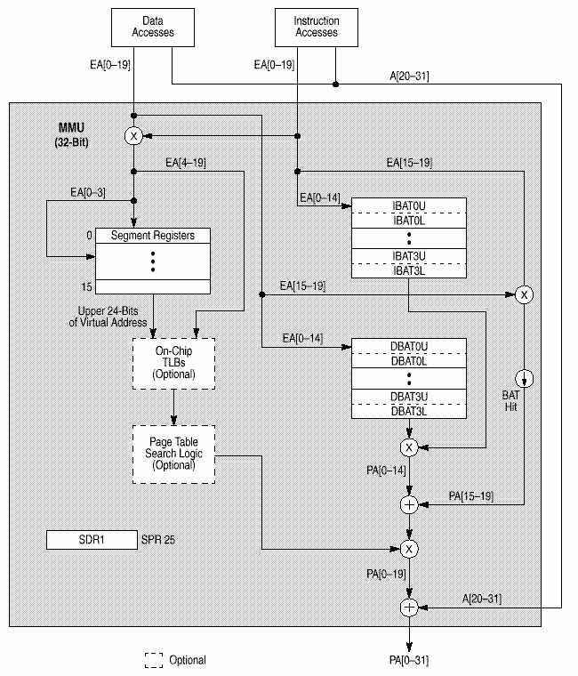 MMU поддерживает до 4 Петабайт (252) виртуальной памяти и до 4 Гигабайт (232) физической памяти для команд и данных со страницами по 4 Кб и сегментами по 256 Мб. MMU контролирует привилегии доступа , разбивая память на блоки и страницы. Вообще, механизм преобразования адресов состоит в преобразовании эффективного адреса в промежуточный виртуальный исходя из сегментной информации и затем в физический по таблицам страниц. Дескрипторы сегментов, используемые для генерации промежуточного внутреннего адреса, хранятся как встроенные 32-разрядные сегментные регистры.