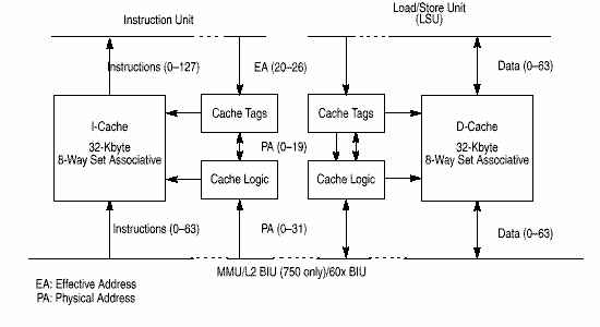 750 имеет независимый встроенный восьмиканальный, 32 Кб, физически адресуемый кэш команд и данных, а также независимые устройства управления памятью команд и данных (memory management unit, MMU). Каждое MMU имеет ассоциативный буфер TLB (DTLB и ITLB) для сохранения адресов недавно использованных страниц. Архитектурой PowerPC также определяется наличие таблиц трансляции адресов блоков памяти (block address translation array, IBAT и DBAT), Подробнее работа памяти описана в соответствующем разделе.