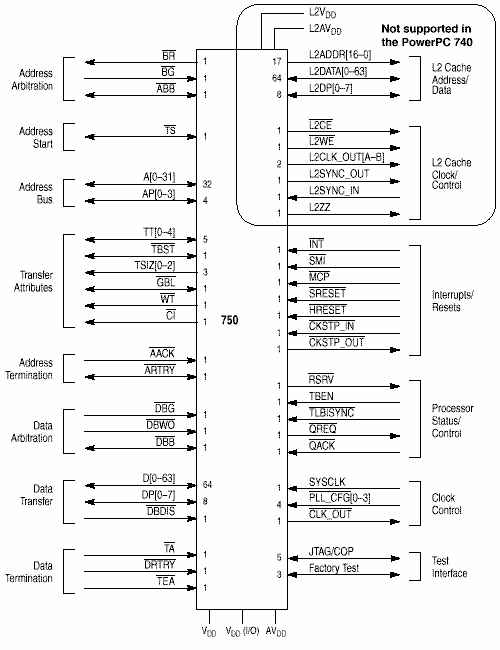 750 имеет 32-разрядную адресную шину и 64-разрядную шину данных. Внешние устройства получают системные ресурсы через устройство внешнего центрального арбитра. В 750 используется MEI (modified/exclusive/invalid) протокол для синхронизации кэша и памяти и предотвращения ошибок при обращении к кэшу.
