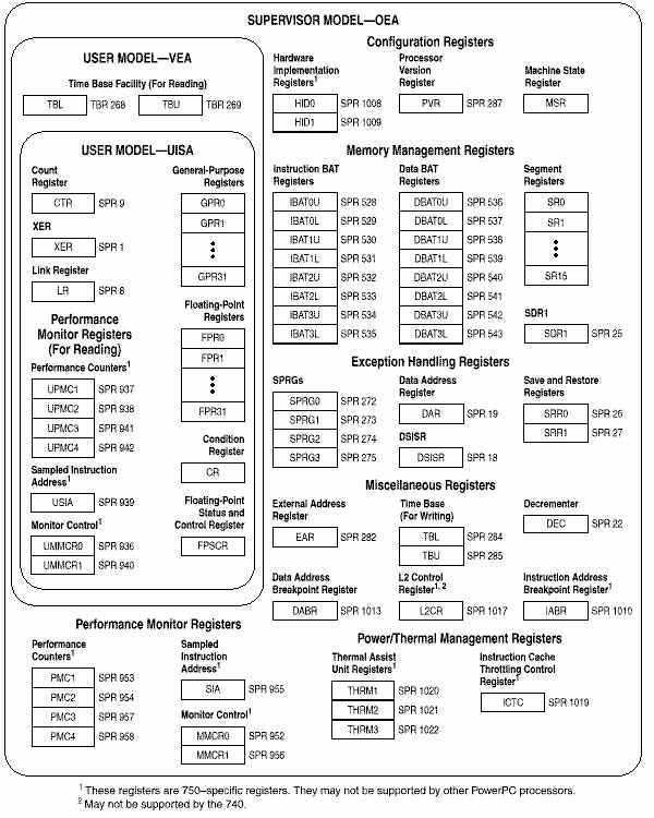 · Регистры уровня супервизора (OEA) — OEA определяет регистры, используемые операционной системой для управления памятью, конфигурированием, обработкой исключений и других функций. Определены следующие 32-разрядные регистры: