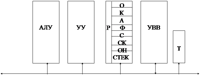 АЛУ - арифметико-логическое устройство; УУ - устройство управления; УВВ - устройство ввода-вывода; Т - таймер; Р - рабочие регистры; регистры: 0 - операндов, К - команд, А - адресов, Ф - флаговые, С - состояний, СК - счётчик команд, ОН - общего назначения, СТЕК - стековые.
