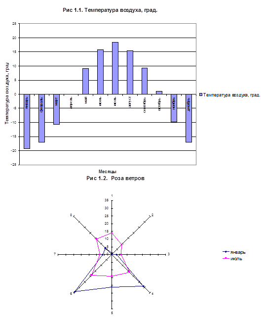 Для рассматриваемого района зимой преобладают ветры южного, юго-восточного и юго-западного направлений. Летом преобладают ветры южного и северного направлений (рис 1.2). Средняя скорость ветра за январь равна 3,41 м/с. Максимум из средних скоростей по румбам за январь — 6,8 м/с. Средняя скорость ветра за июль равна 3,55 м/с. Максимум из средних скоростей по румбам за июль — 4,4 м/с.