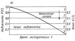 Надежность здания (вероятность его безотказной работы), долговечность и износ могут быть представлены во взаимосвязи графически, как показано на рис. 1, а.