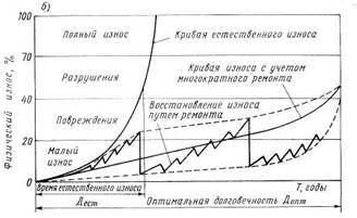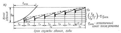 Рис. 3. Виды износа и его возмещение путем проведения периодических ремонтов ( а ), виды износа и оптимальная долговечность зданий ( б )