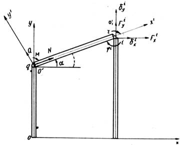 Напряженно-деформированное состояние каждого стержня удобнее характеризировать в локальной системе координат, связанной с ним. Ось х’ этой системы координат направим от “начала” q стержня к его “концу” r (понятие “начало” и ‘конец” условны и нужны только для того, чтобы задать положительное направление на оси х’), ось у’ – в плоскости рамы, а ось z’ – перпендикулярно плоскости. Положительные направления осей y’ и z’ выберем так, чтобы они образовывали с x' правую систему координат.