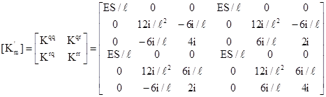 Фактический смысл компонент и блоков матрицы [km’] ясен. Блок [Kqq] и его компоненты характеризуют усилия, возникающие в сечении q стержня при смещении узла q , а блок [Kqr] и его компоненты – усилия в сечении q стержня при смещении узла r . В зависимости от ориентации систем отсчета и правила знаков при определении усилий могут изменятся знаки некоторых компонент матрицы [K’m].