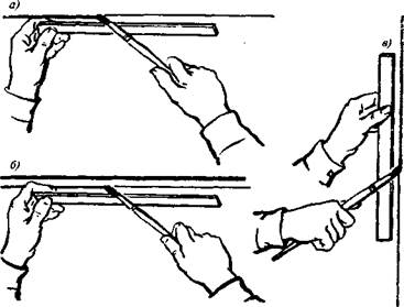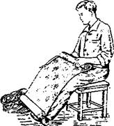 При большом объеме работ следует применять обоеобрезную машину (рис. 7а). Такая машина состоит из двух ножей: верхнего, круглого, приводимого в действие электродвигателем, и нижнего, свободно вращающегося на оси. Ножи обрезают кромку обоев, рулон которых помещен на свободно вращающемся стержне. Полотно обоев пропускают через две пары направляющих валиков, между которыми и расположены ножи. Обрезанные обои перематывают на стержень. При небольшом объеме работ обои обрезают ножницами вручную (рис. 7.6); маляр сидит на табуретке, а кусок обоев кладет на вытянутые вперед ступни ног.