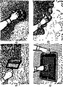 Проклейка поверхностей. Клеевой раствор наносят на поверхности маховой кистью после прочистки стен лещадью. Проклеивать нужно не все поверхности сразу, а лишь их часть, чтобы до оклейки макулатурой они высохли не полностью, а лишь успели слегка провянуть. Для оклейки поверхностей под обои чаще всего используют газеты, которые укладывают на полу стопкой и намазывают клейстером. Эту работу выполняют два маляра. Один намазывает листы макулатуры маховой кистью и подает их, а второй прикладывает намазанные листы к поверхности стены и разглаживает ветошью или волосяной щеткой так, чтобы на бумаге не оставалось морщин и пузырей. Инструменты для обойных работ показаны на рис. 11.6.